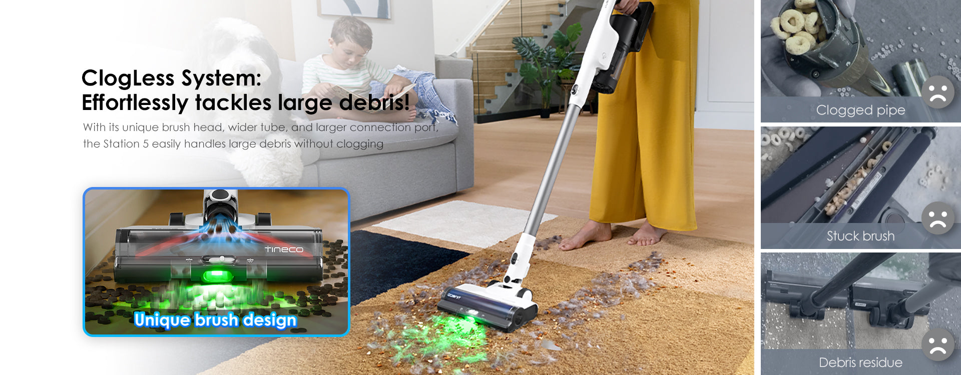 - ClogLess System:The unique brush head design, combined with a wider tube and a larger connection port inside the vacuum, allows the Station5 to easily pick up large debris without clogging.