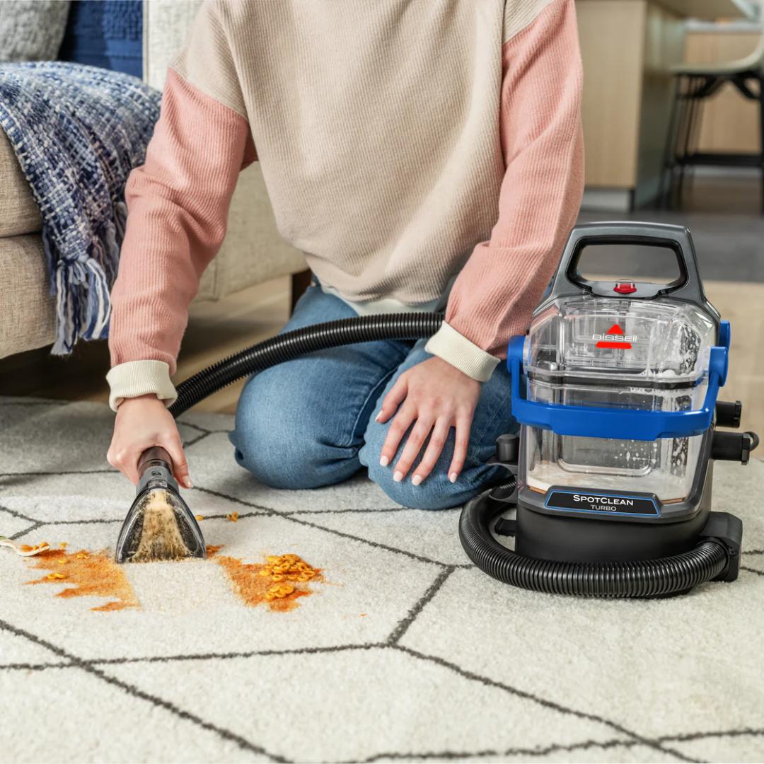 Enjoy professional-style results with the NEW SpotClean™ Turbo – now 50% quieter than the previous model. Get ultimate stain extraction with the strongest suction power, extra-large capacity tanks, new 4″ Self-Cleaning Tough Stain Tool, plus a durable and flexible hose making it easy to clean carpet and upholstery in hard-to-reach areas.