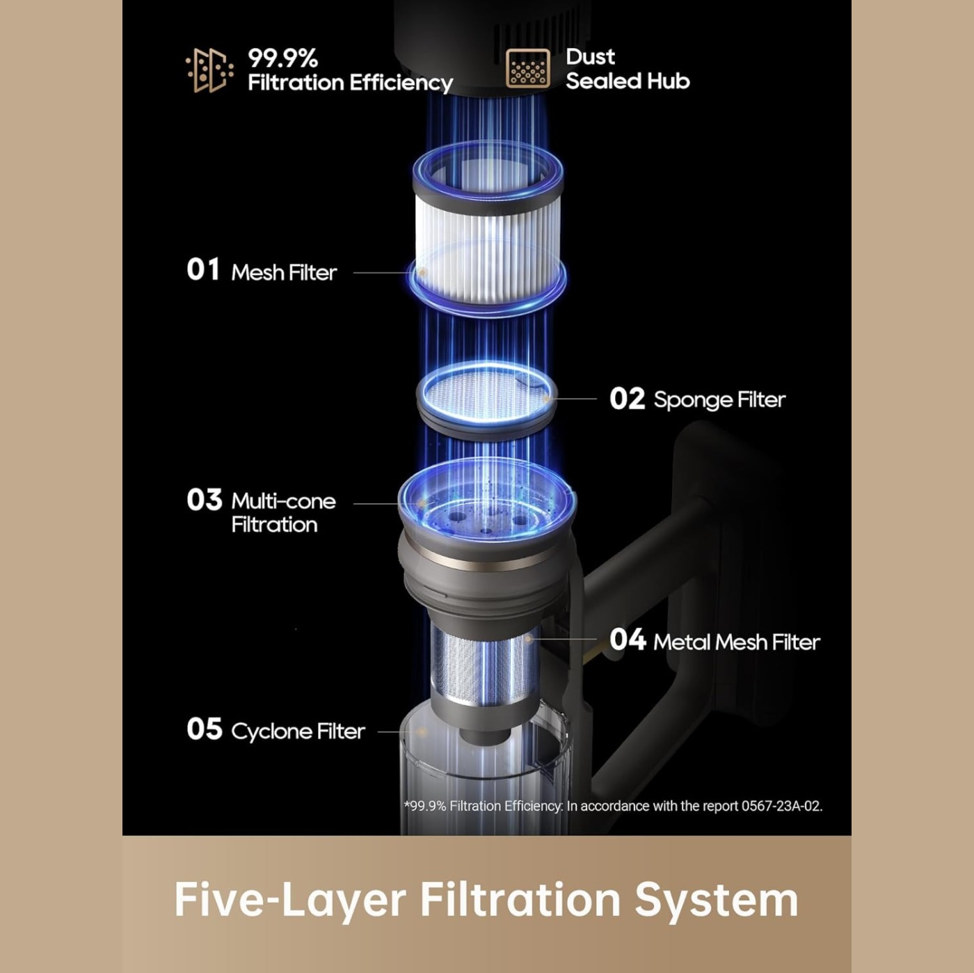 - [Five-Layer Filtration] The vacuum has an advanced five-layer filtration system that captures and eliminates fine dust and particles with an efficiency rate of up to 99.9%.