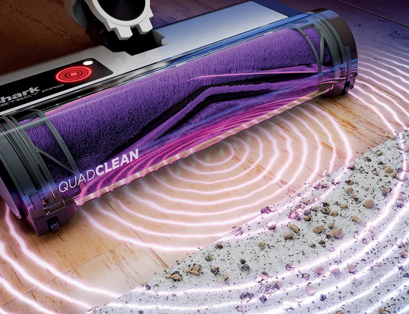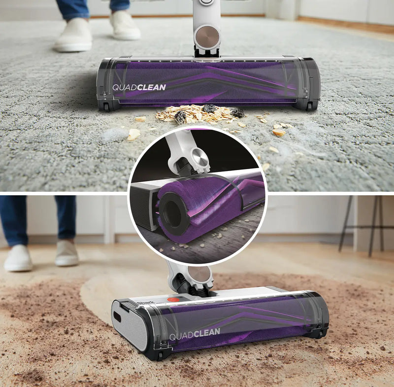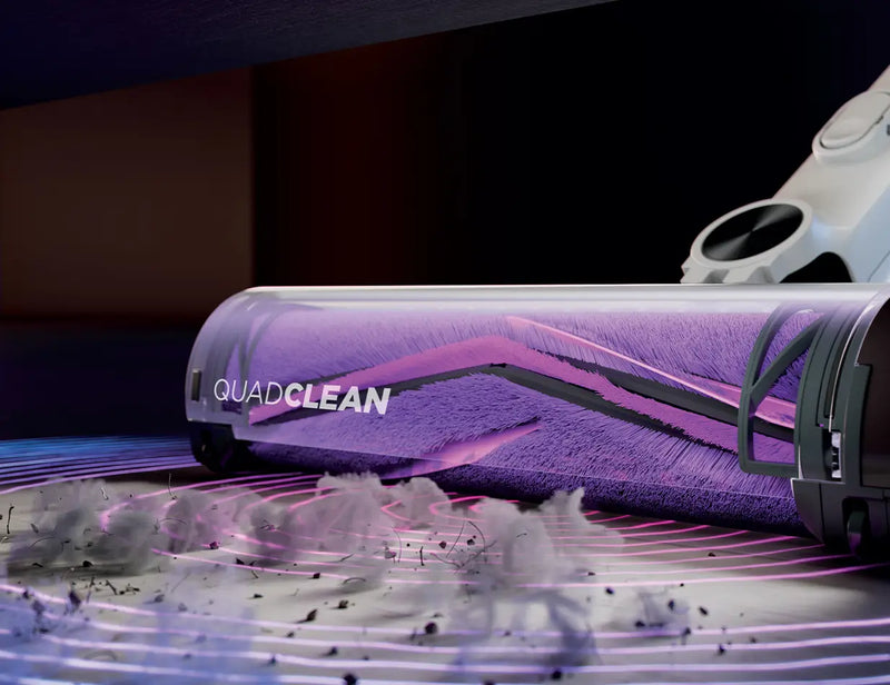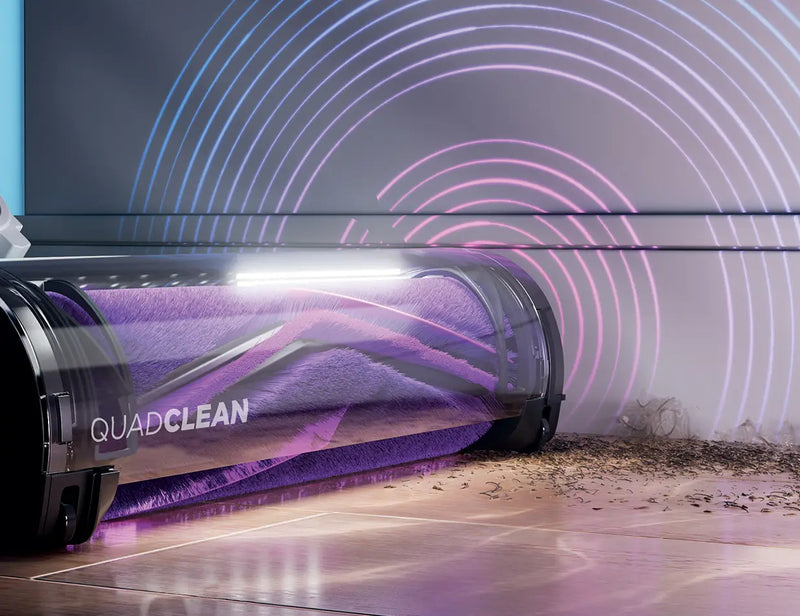 The QuadClean Multi-Surface Brushroll automatically detects the floor surface and effectively tackles dust, pet hair and large debris.